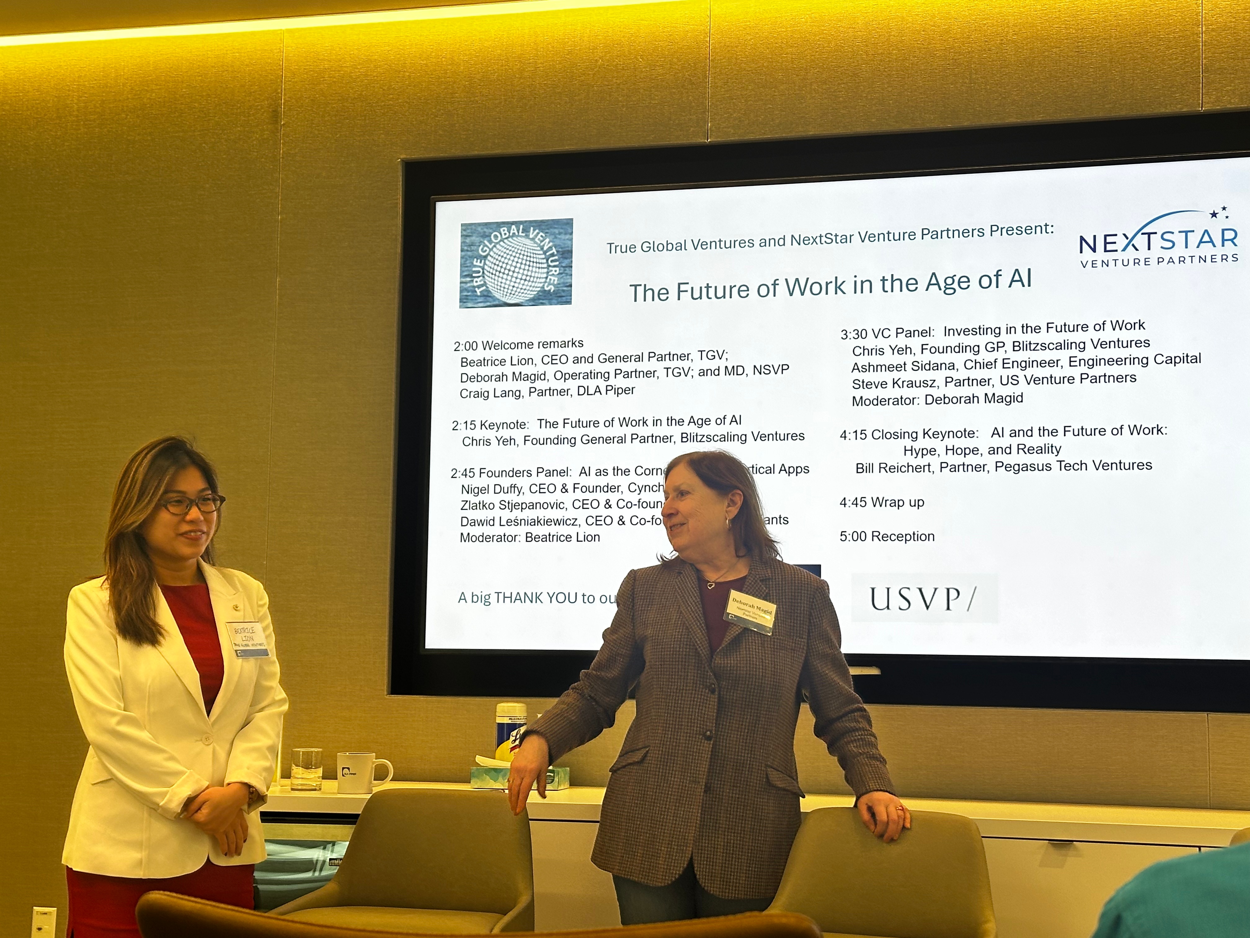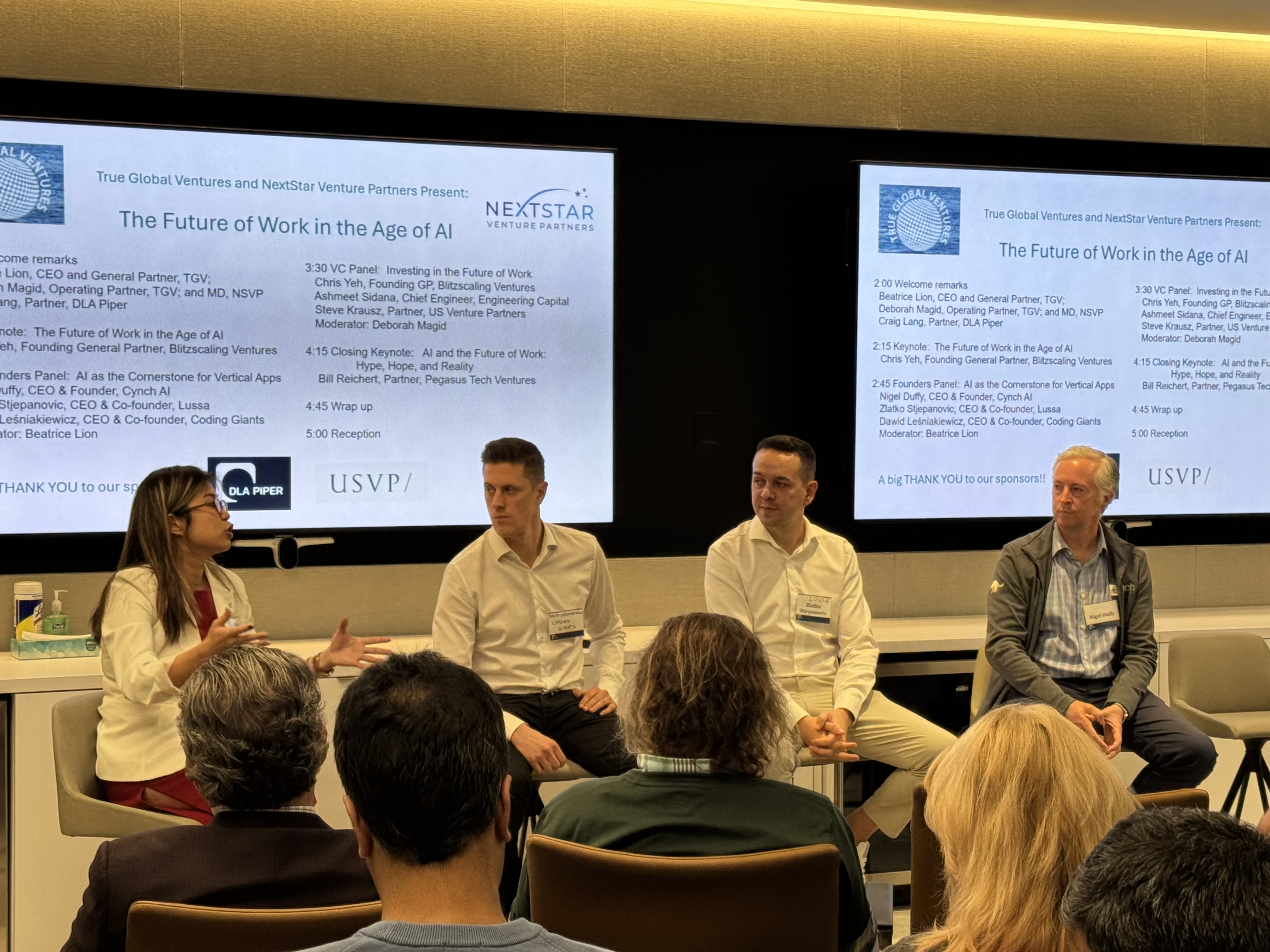 As background, panel moderator Deb Magid cofounded NextStar Venture Partners and helps run operations at global VC powerhouse TGV. Beatrice Lion TGV’s CEO ran her own startup panel discussion with Coding Giants, Cynch AI and Lussa during the event. Those founders discussed AI in education, tax prep and gaming.